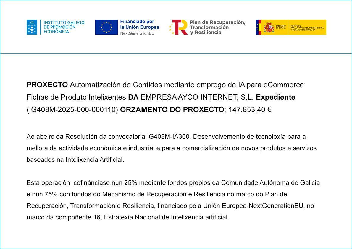 Ayco Internet gracias a la ayuda recibida ha desarrollado un proyecto que empleando la IA para crear y mejorar la información de productos que comercializan sus clientes en sus tiendas online, definiendo qué características estamos buscando